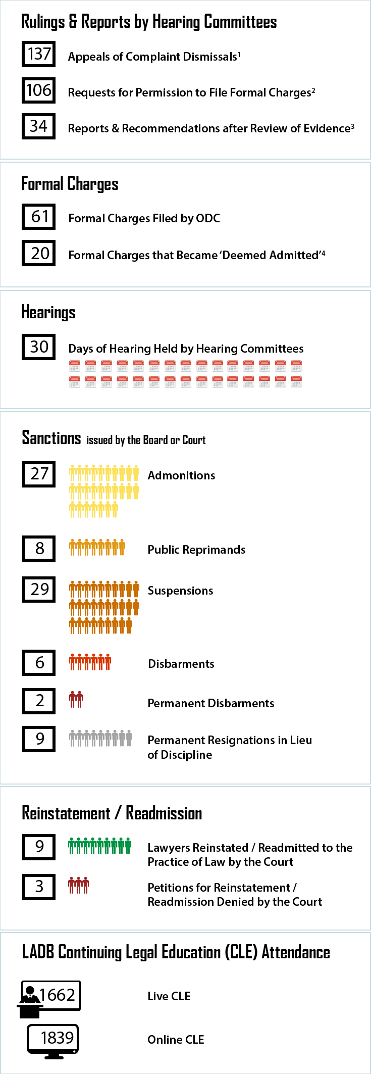 The most recognized form of disciplinary procedure in Louisiana starts with the filing of formal charges by the Office of Disciplinary Counsel (“ODC”). ODC will prosecute the charges before a hearing committee of the Board, which will issue a report and recommendation. The Board’s adjudicative committee will conduct an appellate review of the committee’s findings and conclusions, then issue a recommendation to the Louisiana Supreme Court (“the Court”). The Court will review the entire record, along with the recommendations of the committee and Board, then issue a final ruling in the matter. See generally Louisiana Supreme Court Rule XIX, §11.